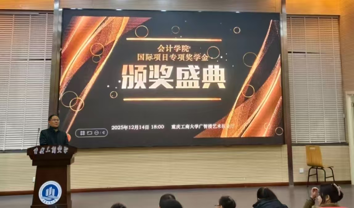 2025年12月14日18:00至20:00,会计学院国际项目颁奖典礼暨联谊晚会在重庆工商大学兰花湖校区广智楼艺术报告厅成功举行。本次颁奖典礼暨联谊晚会由会计学院国际教育中心承办,会计学院专职组织员尹建平、党委副书记郝颖、会计学院副院长梅波、国际教育中心主任宋昕倍、楷柏财经高校运营项目负责人李春凤、国际教育中心行政秘书张悯弱、2025级国际项目辅导员何广琼、与2024级学生代表及2025级全体新生共同出席了本次晚会。宋昕倍担任颁奖典礼主持人,2025级ACCA1班刘欣悦、CIMA班杨宏博担任国际项目联谊晚会主持人。